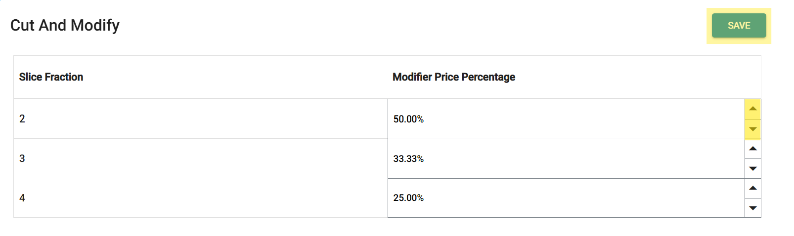 On the Cut And Modify screen, update an existing Slice Fraction by clicking the upwards facing triangle ▲ to increase or downwards facing triangle▼ to decrease the Modifier Price Percentage. Once your updates are complete, click Save.