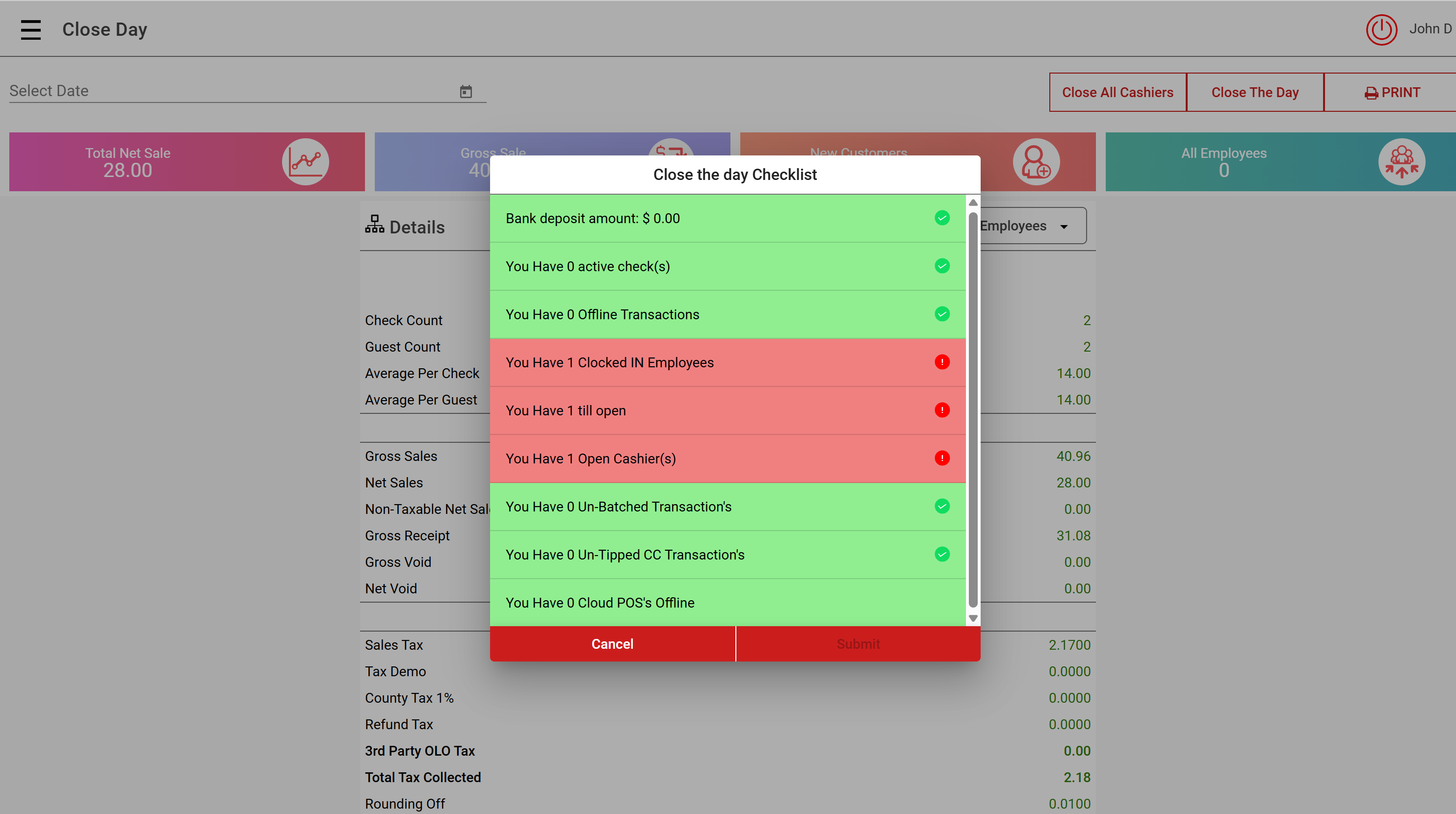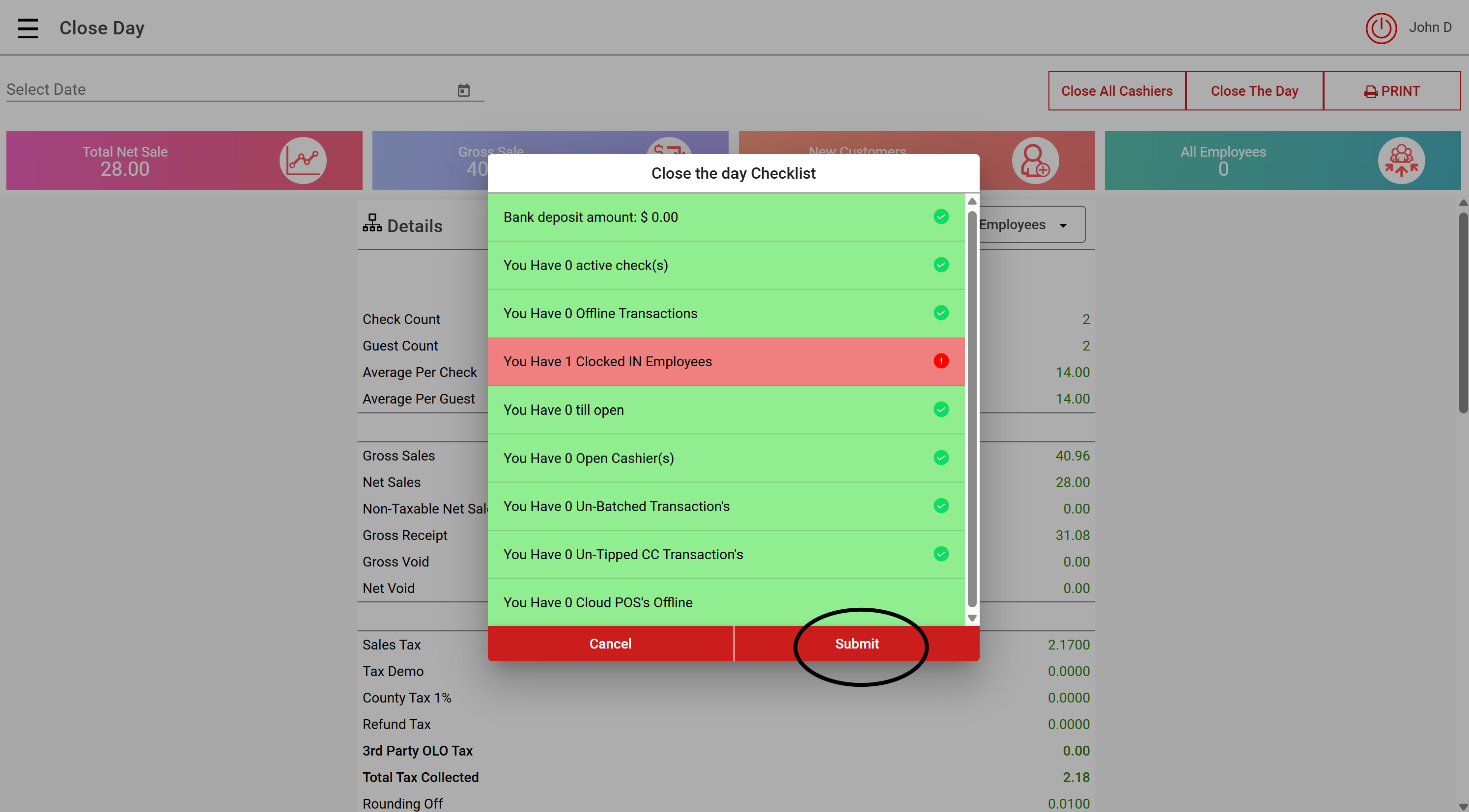 Once you complete all appropriate tasks, select "Submit" to Close the Day: