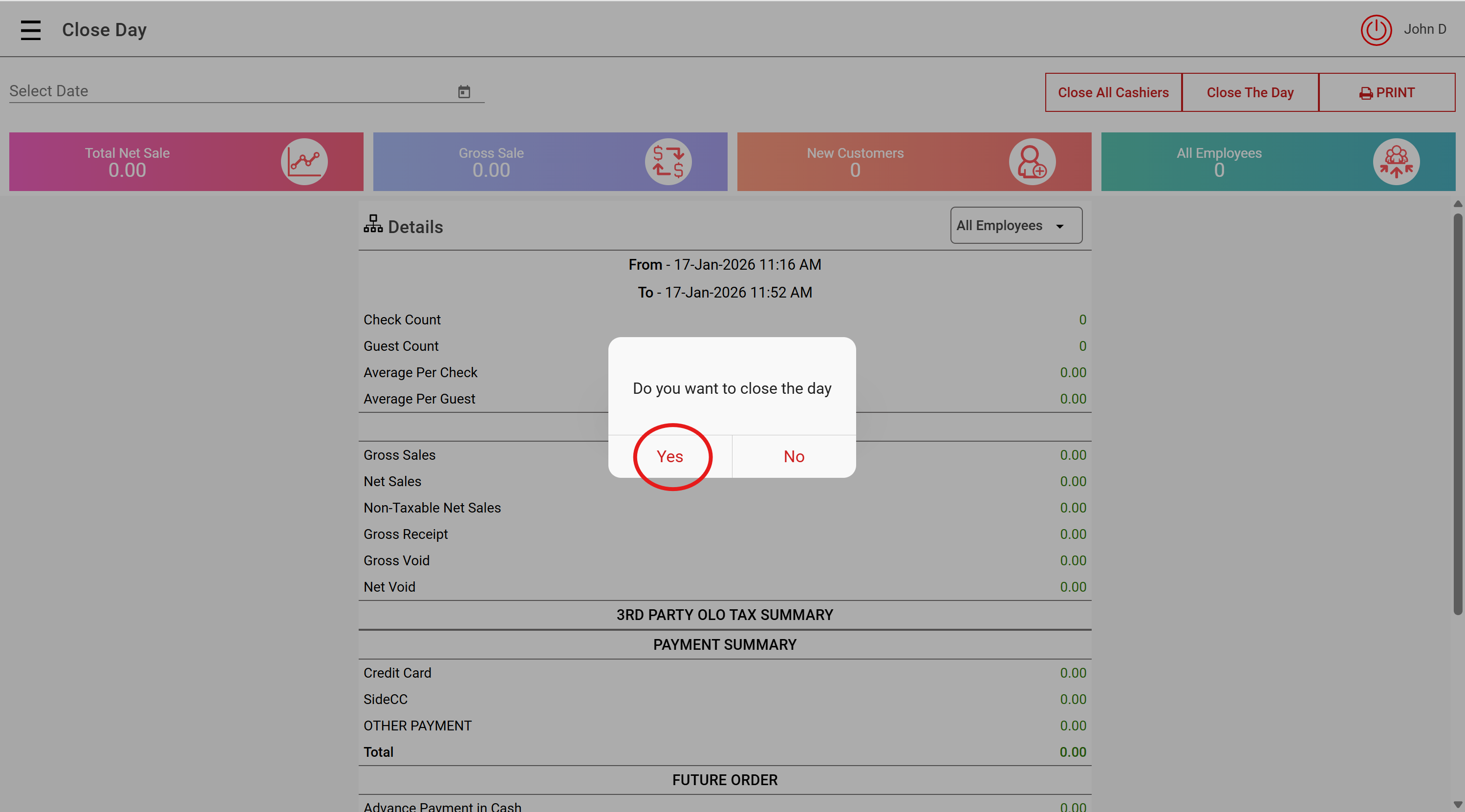 Next, select Close The Day and Select "Yes":