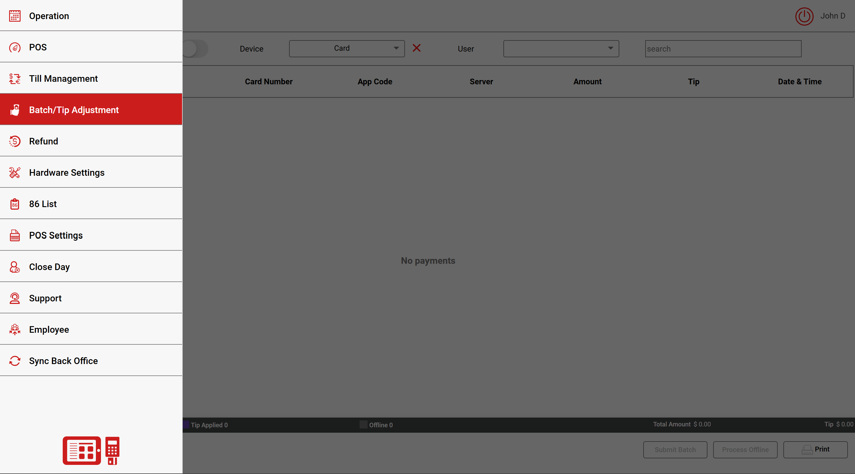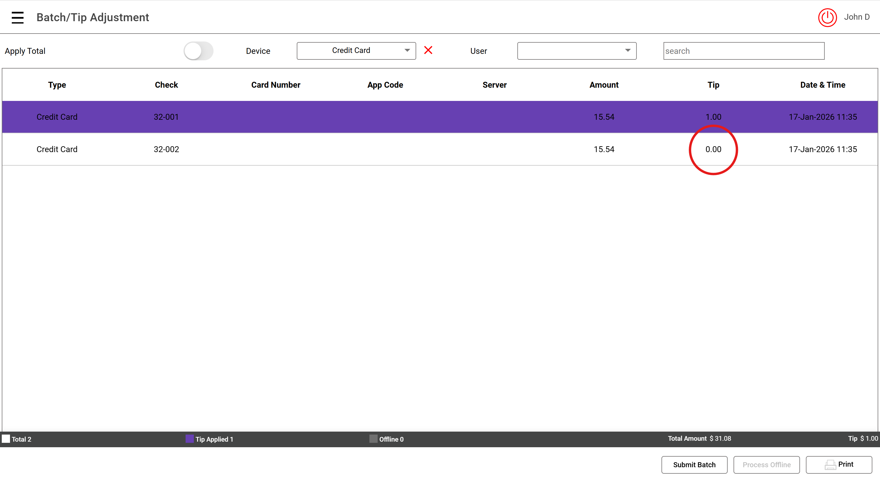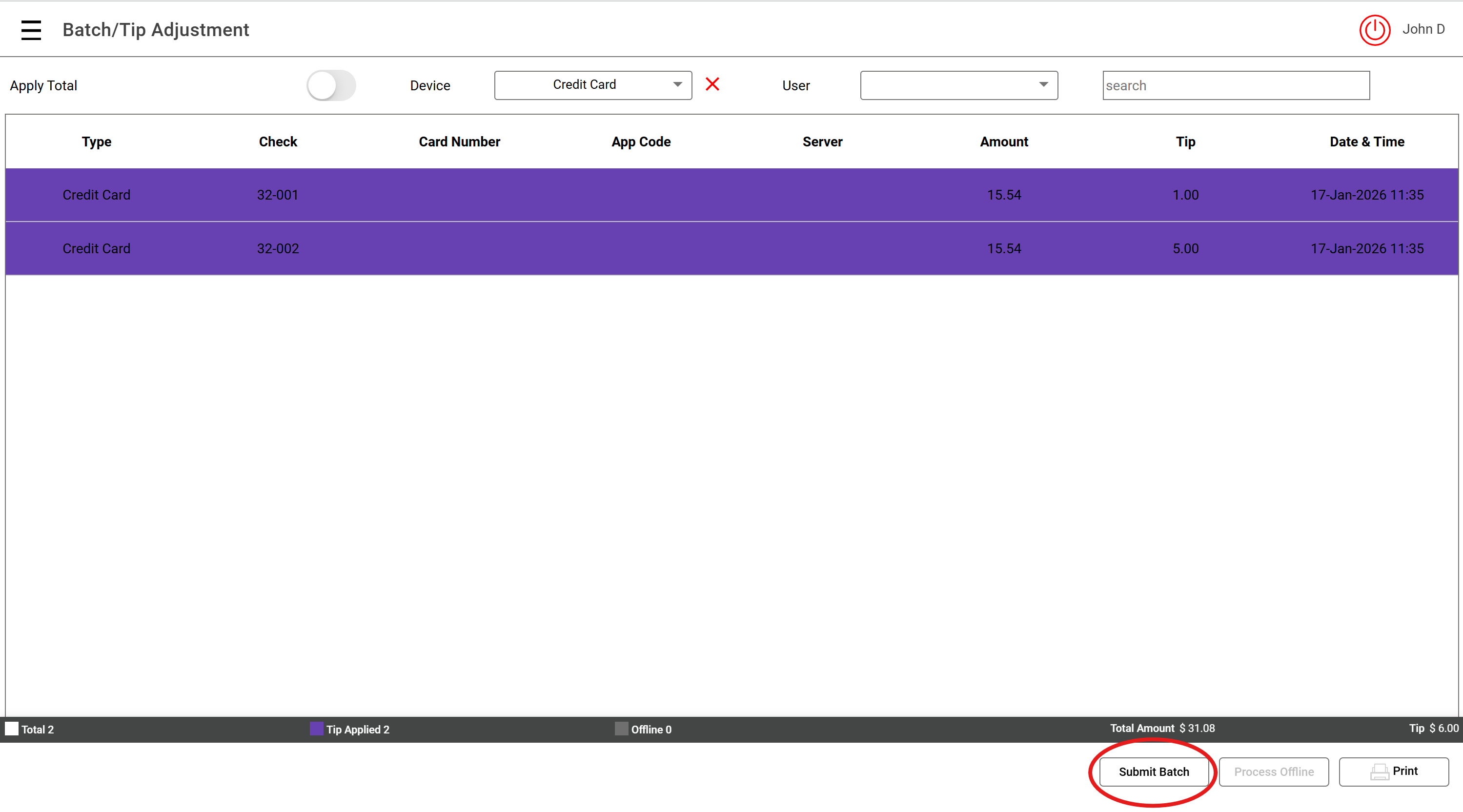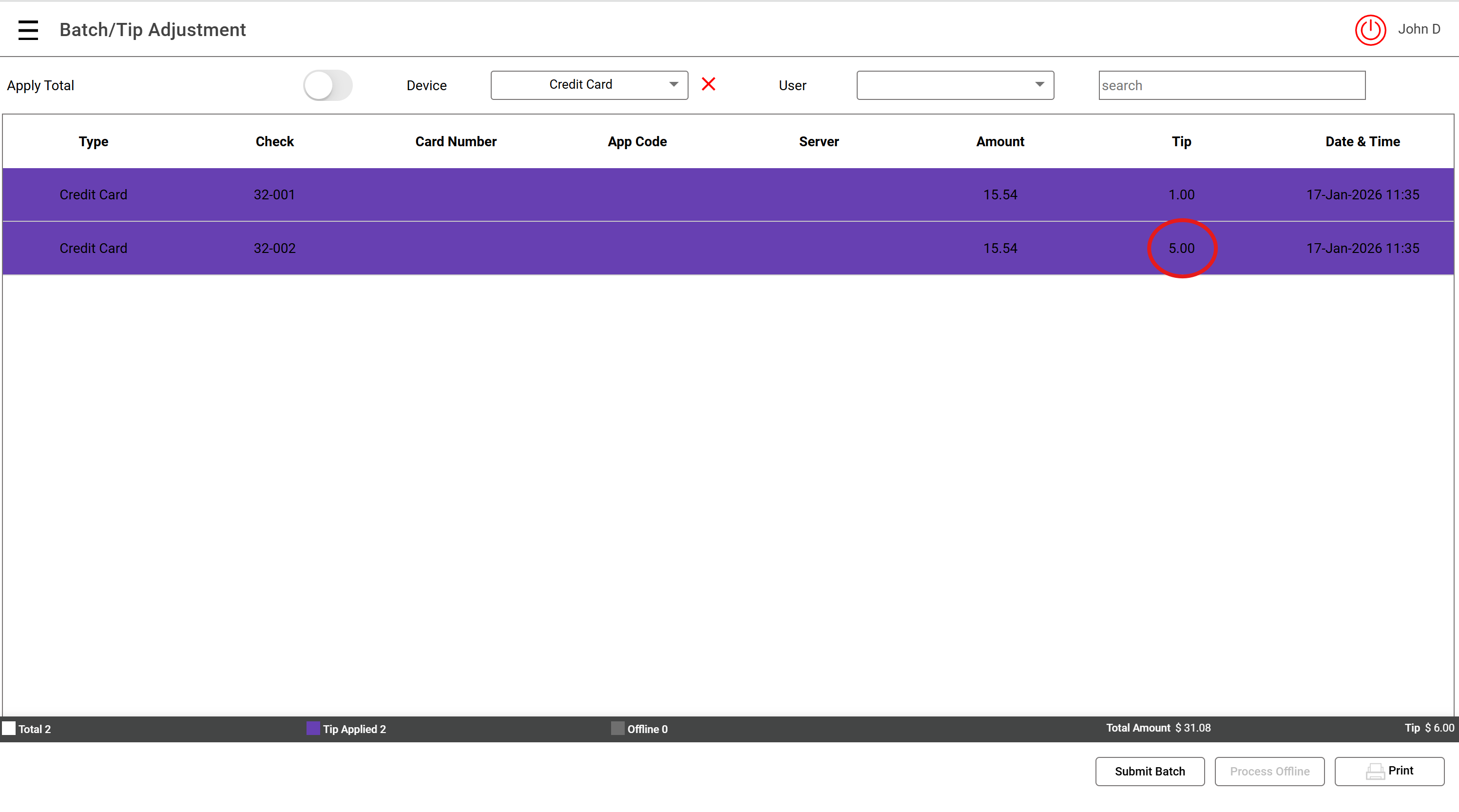 Note: Purple highlight indicates Tip has already been added to the card transaction