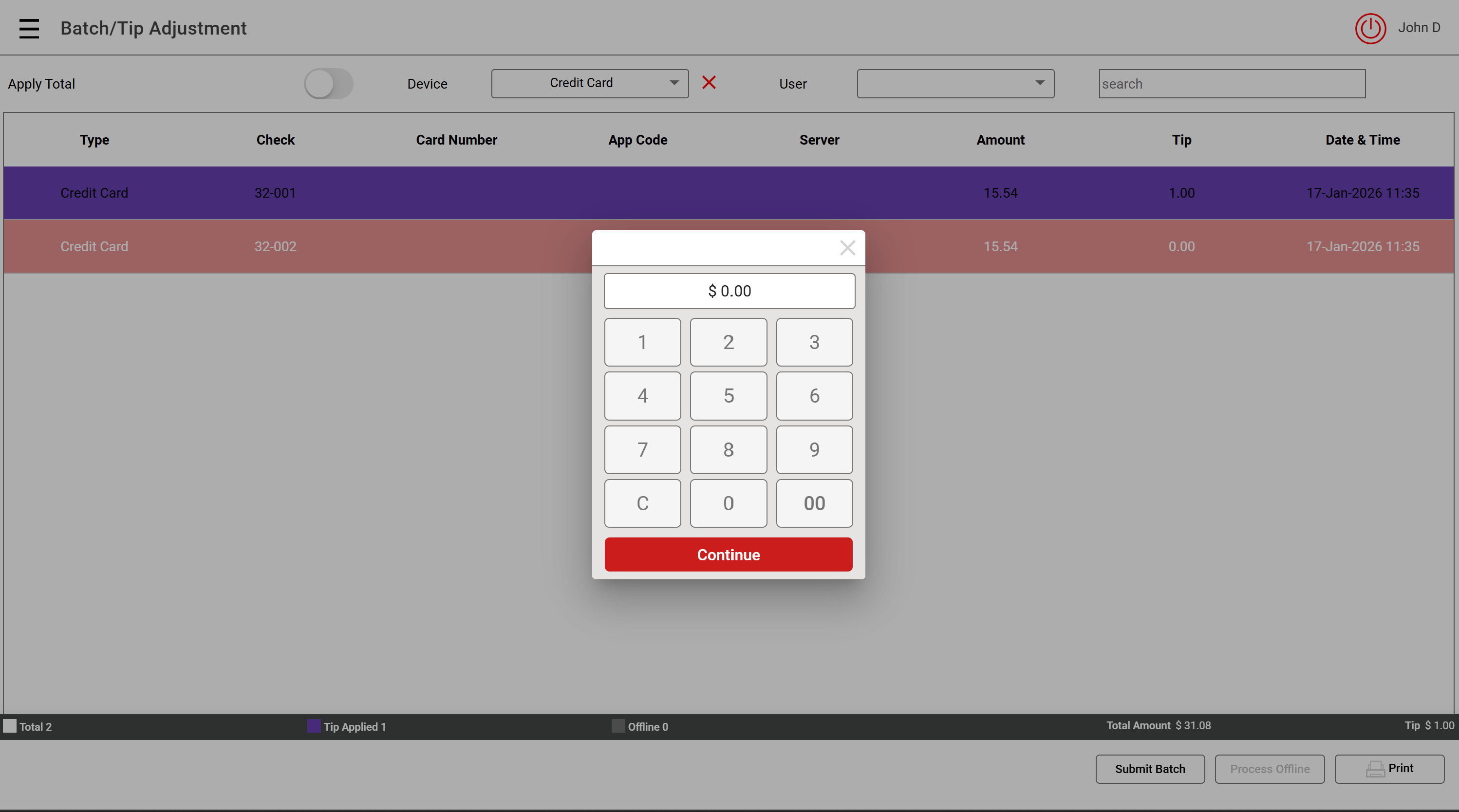 Note: If you need to re-enter or edit the entered Tip amount, select the Tip amount on the transaction and re-enter the amount.