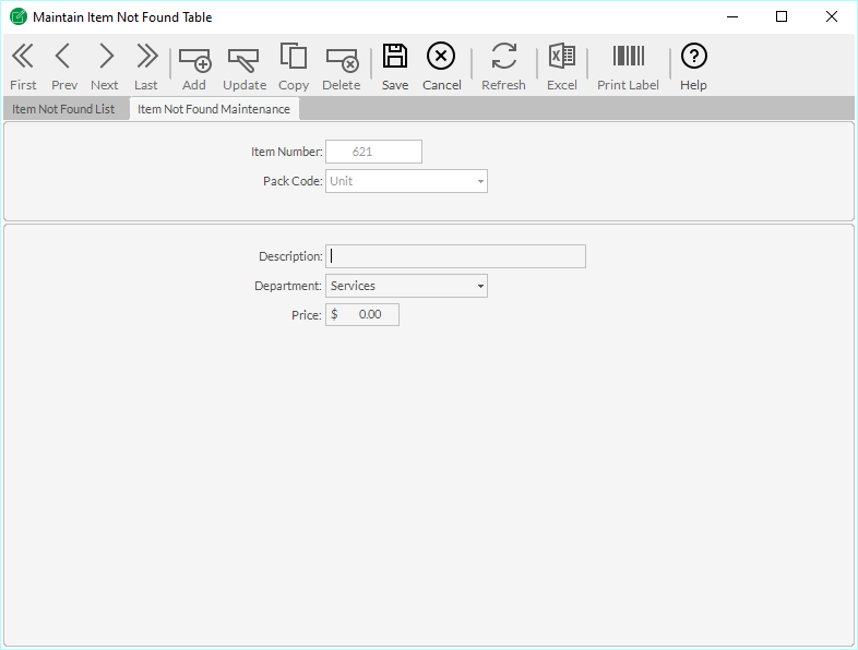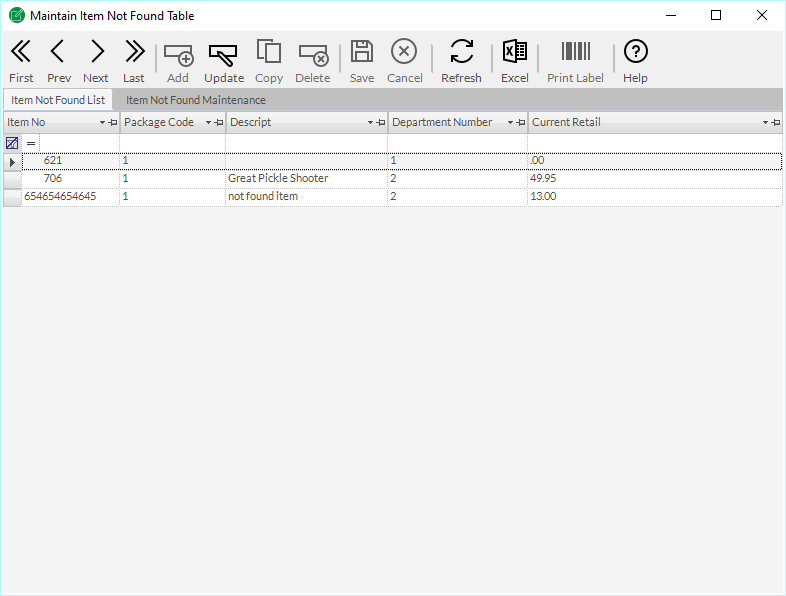 The Maintain Item Not Found Table list allows you to quickly view the Maintain Item Not Found Table. The Maintain Item Not Found Table Screen is located in the Tools section of the menu. As with most screens it utilizes the default toolbar as well as the tabbed layout of the data.